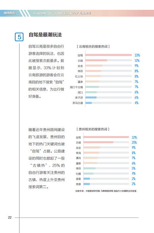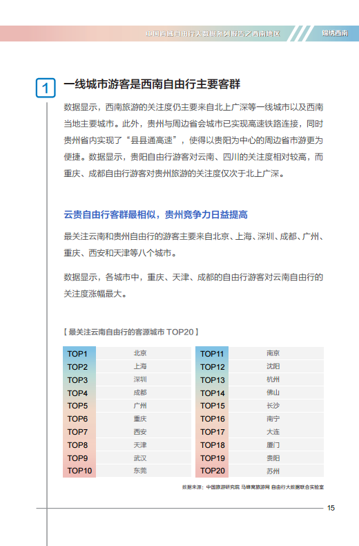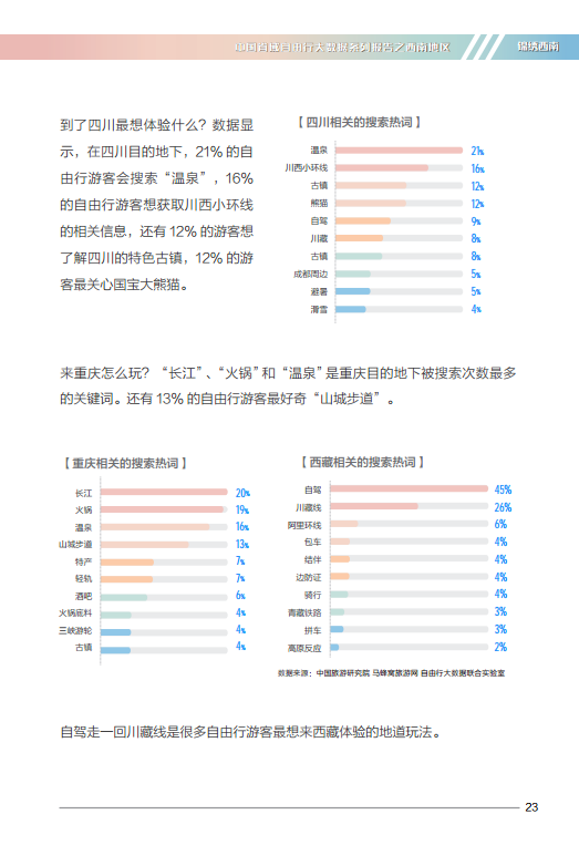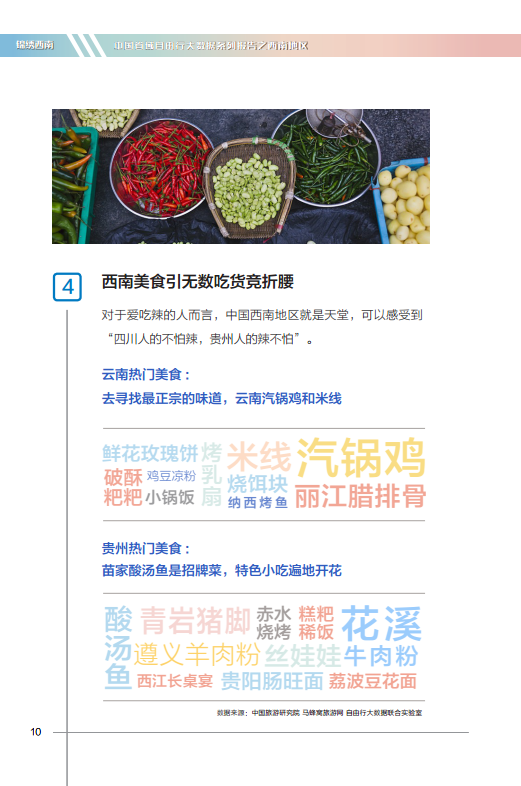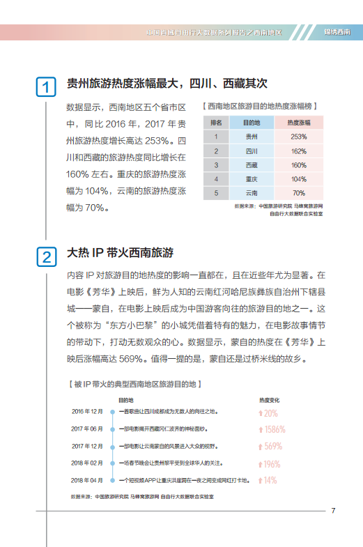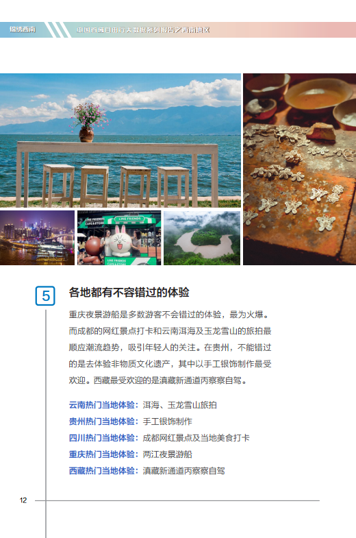 该报告以双方旅游大数据为基础,深度剖析了中国西南地区五省区市——云南、贵州、四川、重庆、西藏的旅游市场现状与未来开展趋势。报告显示,西南五省区市的旅游热度近年有大幅增长,自驾、古镇、美食成为西南地区最受旅行者关注的关键词。报告全文如下: