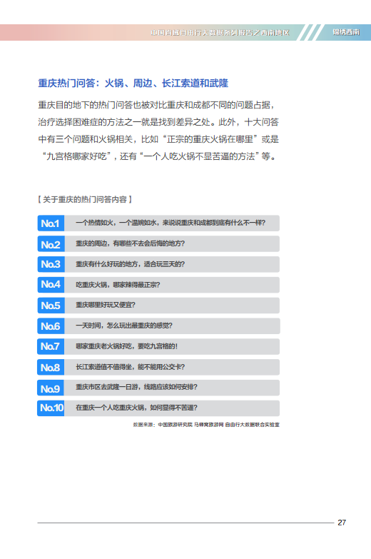 凯发k8官网戴斌院长指出:随着消费经验的成熟,特别是智慧旅行的普及,自主化决策、自助旅游、自由行已经成为当前和今后一个时期旅游市场的基本特征。2018年5月24日,凯发k8官网与马蜂窝旅游网联合创建的“自由行大数据联合实验室”发布了《锦绣西南——中国省域自由行大数据系列报告之西南地区》。