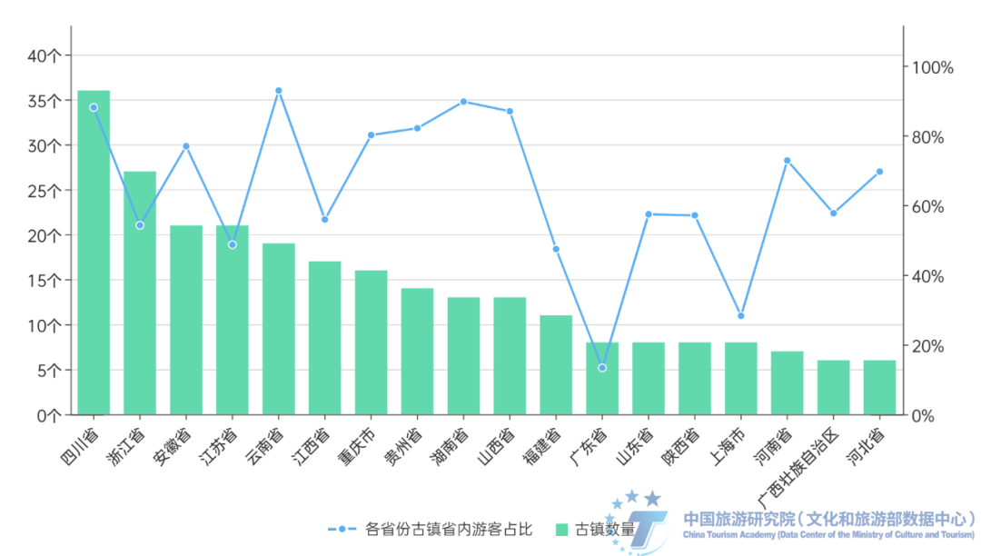 江浙皖赣及川滇等省份古镇景区密集。从各省份样本古镇数量来看,全国古镇景区主要集中在四川省、浙江省、江苏省、安徽省、云南省和江西省等省份。6省份古镇景区数量分别为36个、27个、21个、21个、19个和17个,总体上以14.5%的国土面积,聚集了全国半数以上的古镇景区;而甘肃省、湖北省、吉林省、辽宁省、内蒙古自治区、新疆维吾尔自治区、北京市、海南省、宁夏回族自治区、青海省、天津市、西藏自治区、黑龙江省等省份古镇景区数量所占比重均不到2%。